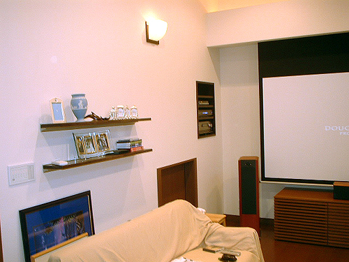 プロジェクターは中二階が蔵になっていましたので(ミサワホームの蔵のある家)その部分を加工して映写できるようにしています。